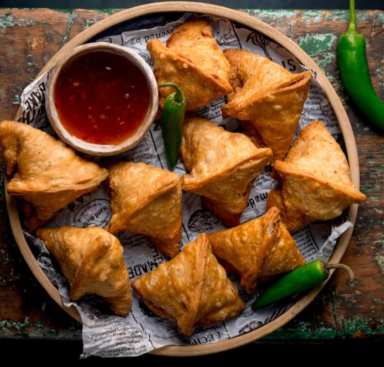 Served two per order with a sweet chili dipping sauce. Best served with a thicker, milkier tea. Ask about our Schezwan variety for more spice!