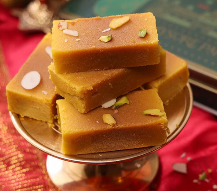 A decadently sweet dessert, traditionally served with more mellow teas. A perfect mix of ghee (clarified butter), flour and sugar cooked over a hot pot until a thick paste forms. It is then cooled until it can be cut into portioned squares, garnished with a touch of slivered pistachios on top.