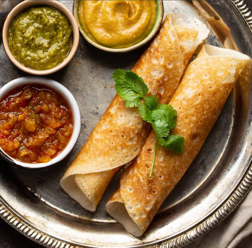 Dosa is a thin, crispy crepe-like dish made from fermented rice and black gram. It has quite the crunch, and is accompanied by a coconut chutney, a vegetable stew called Sambar, tomato chutney, and a potato masala hash, all used for dipping and combining to your hearts content.