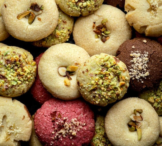 A collection of small, assorted cookies in traditional Thavnairian flavor pairings. Includes Pistachio Honey thumbprint, Basil Rose, Chocolate Saffron and Cardamom Mango thumbprint. All cookies were made the night before opening and have the texture of a typical shortbread.