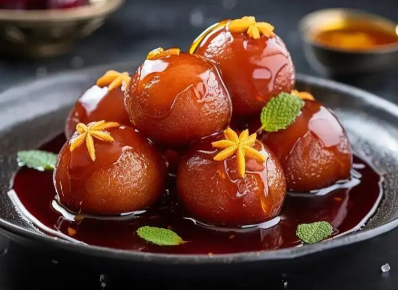 Bringing a dessert traditionally served in weddings to your table. Dough balls are fried in ghee until crispy, then soaked over night in a sugar syrup made from sugar, rose water, cardamom, saffron and lemon juice. It is finished off with a sprig of mint and a few small strands of saffron placed on top.