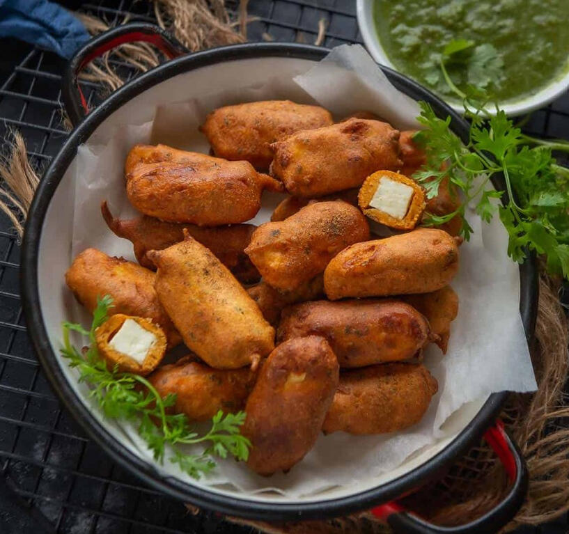 Who doesn't love battered, deep fried cheese? Bite-sized cubes of paneer cheese are coated in a batter of spices, including chaat and graham masala, chili powder, ajwain and ginger green chili paste before being deep fried to a golden, crispy perfection.